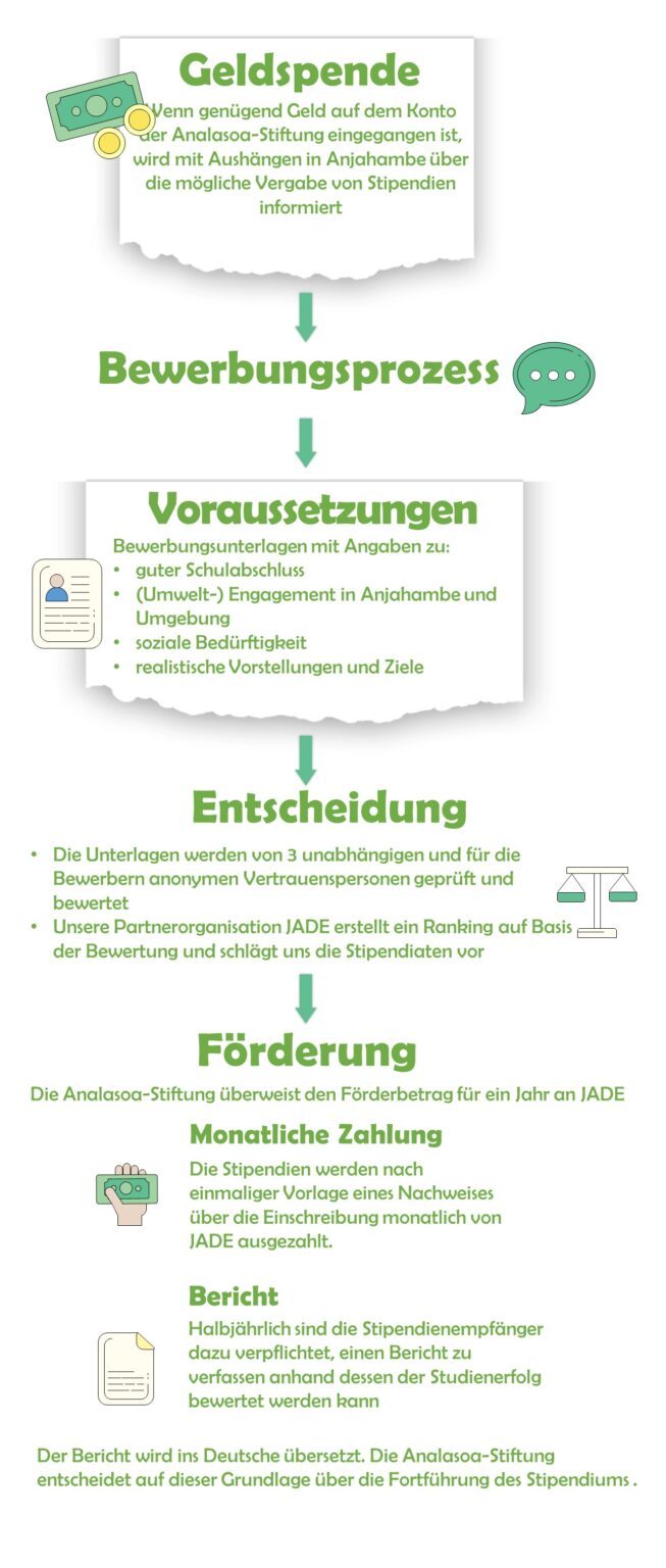 Schon im Februar 2024, nur zwei Monate nach Gründung der Stiftung, hatten wir genügend Spenden gesammelt, um zum ersten Mal die Vergabe von Stipendien in Anjahambe bekannt zu machen. Nach Prüfung der Bewerbungen und auf Vorschlag unserer Jury vor Ort beziehen Delia und Tridia seit Dezember 2024 eine monatliche Unterstützung. Die Förderung wurde vorerst auf ein Jahr befristet, konnte aber nach den eingereichten Berichten über den Studienfortschritt auch ab 12/2025 weiter gewährt werden. Delia hat ihren Bachelor in Jura erfolgreich bestanden und befindet sich im Masterstudium. Tridia hat das zweite Studienjahr Wirtschaftslehre begonnen.